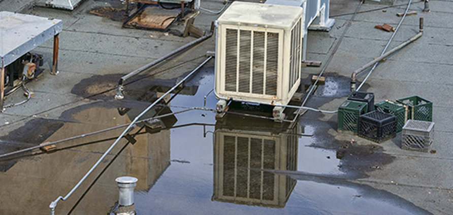Membrane deterioration can be caused by rooftop equipment. Discharge from HVAC units and grease fans can be harmful to the roof system. Overflow from AC drainage pans can cause runoff that ponds on the roof, leading to deterioration and moisture infiltration.